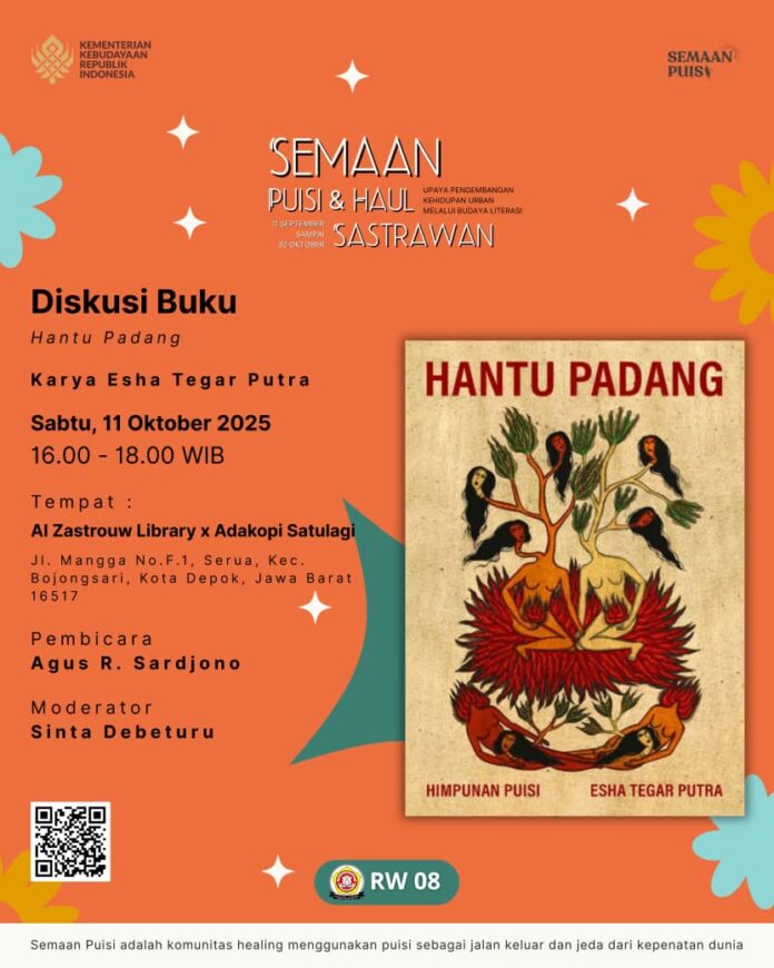 Sabtu sore, 11 Oktober 2025, Al-Zastrouw Library kembali akan menjadi tempat berkumpulnya para pencinta sastra. Di antara rak-rak buku dan suasana yang akrab, sebuah diskusi akan digelar: membedah kumpulan puisi Hantu Padang karya Esha Tegar Putra. Acara yang berlangsung pukul 16.00 hingga 18.00 WIB ini menghadirkan Agus R. Sarjono, penyair dan akademisi terkemuka Indonesia, sebagai narasumber utama, dan akan dipandu oleh Sinta Debeturu sebagai moderator.