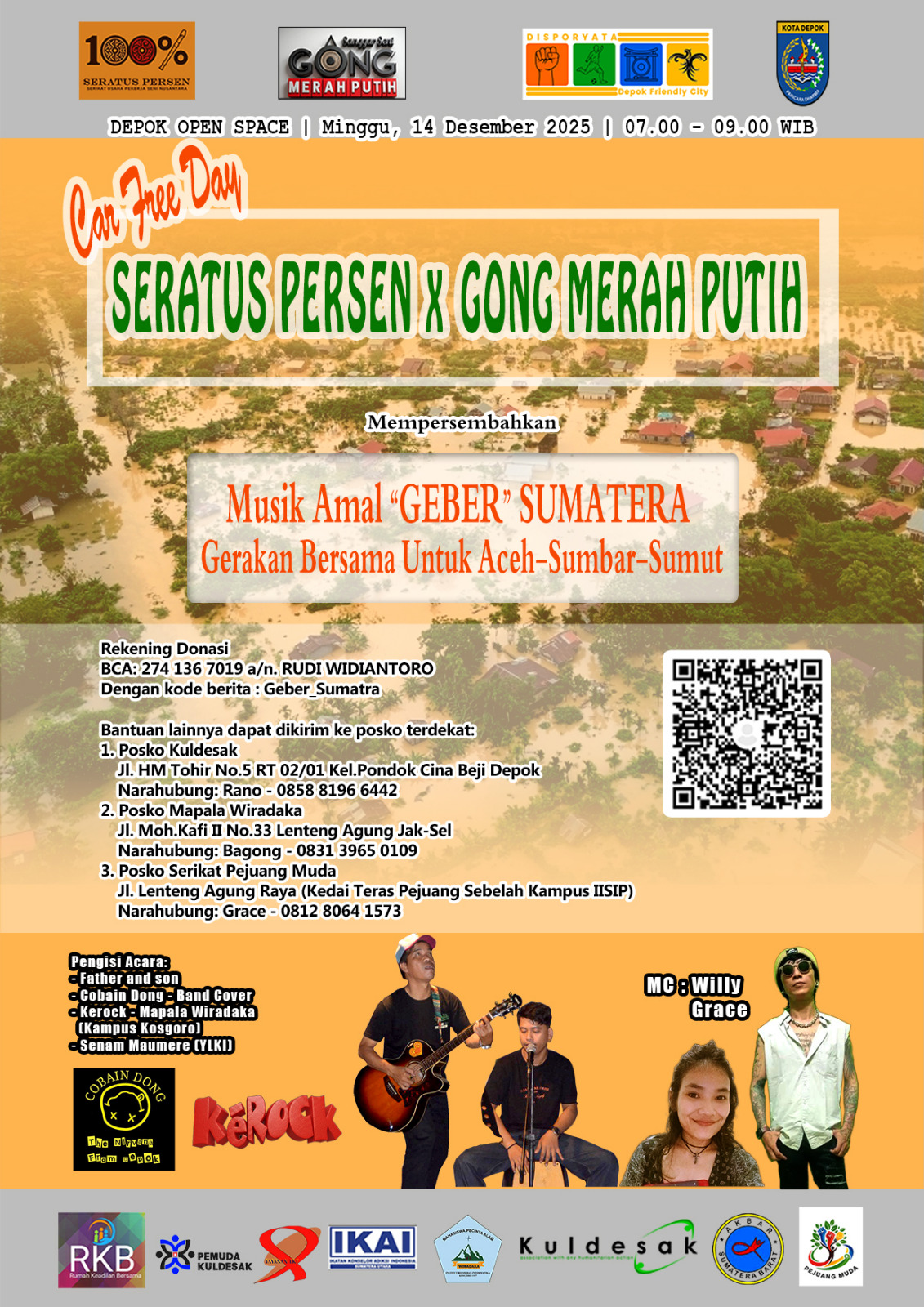 DEPOK — Suasana kebersamaan dan kepedulian terasa kuat di kawasan Depok Open Space pada Minggu pagi (14/12/2025) , saat Musik Amal “GEBER Sumatera”, Gerakan Bersama untuk Aceh, Sumut dan Sumbar digelar oleh Seratus Persen berkolaborasi dengan Gong Merah Putih. Di tengah aktivitas car free day, ratusan warga hadir, berbaur, dan menunjukkan solidaritas untuk membantu saudara-saudara di Aceh, Sumatera Utara, dan Sumatera Barat yang terdampak banjir bandang.